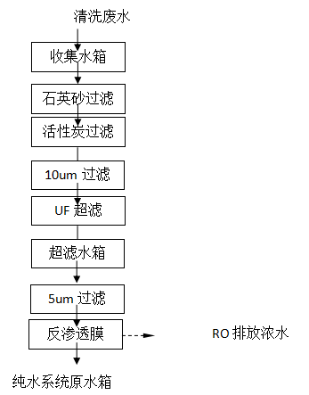 工藝路線:清洗廢水→收集水槽→石英砂過濾器→活性炭過濾器→保安過濾器→超濾→反滲透係統→純水係統原水箱